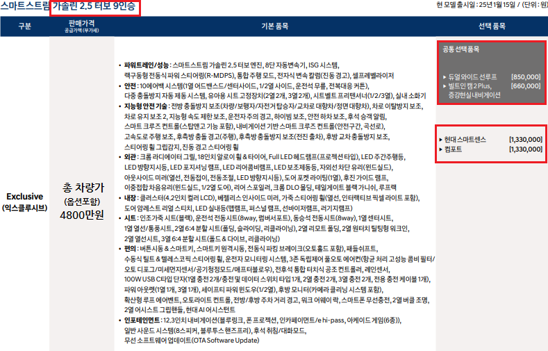 2.5T_9인승 익스클루시브 등급 및 옵션 추가