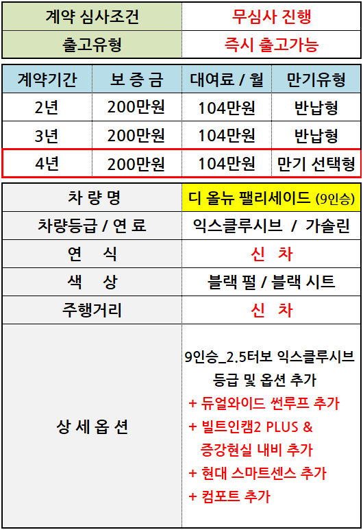 [신차] 팰리세이드_9인승 / 월 104만원
