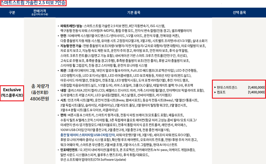 2.5T_7인승 익스클루시브 등급 및