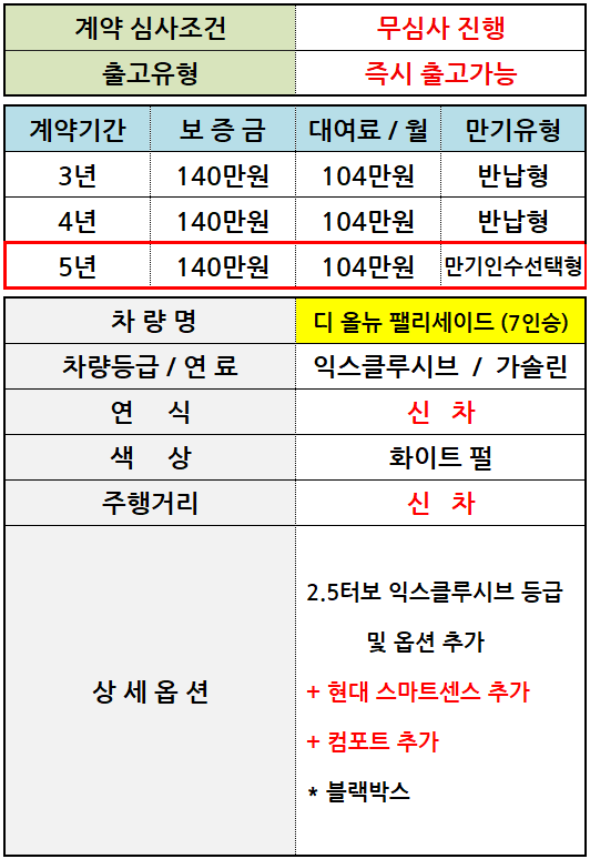 [신차] 팰리세이드_7인승 / 월 104만원