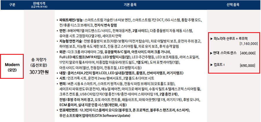 ▶옵션: 1.6 터보 모던 등급 및 옵션 추가