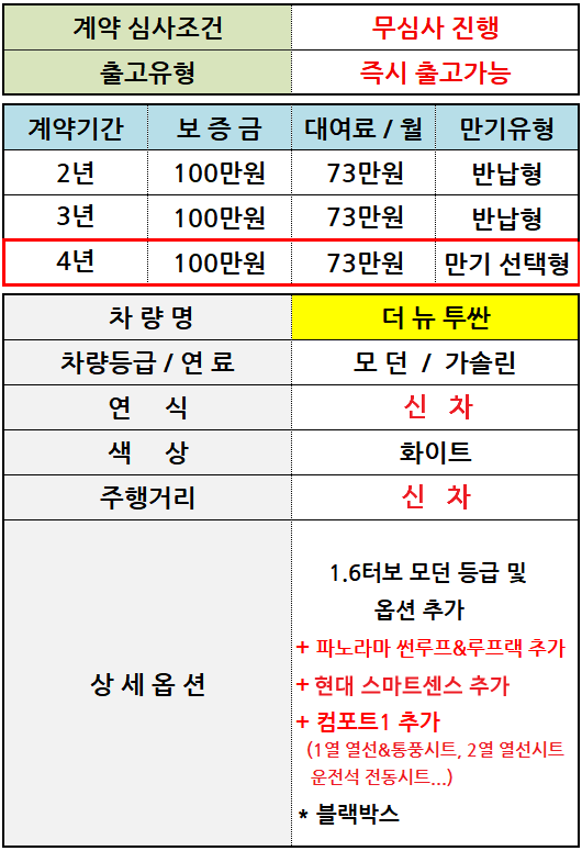 [신차] 투싼_썬루프_가솔린 / 월 73만원