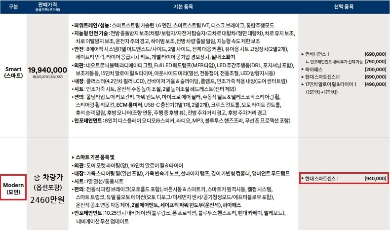▶옵션: 1.6 가솔린 모던 등급 및 옵션 추가