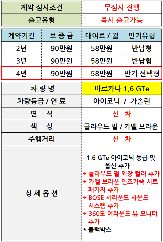 [신차] 아르카나 1.6GTe / 월 58만원