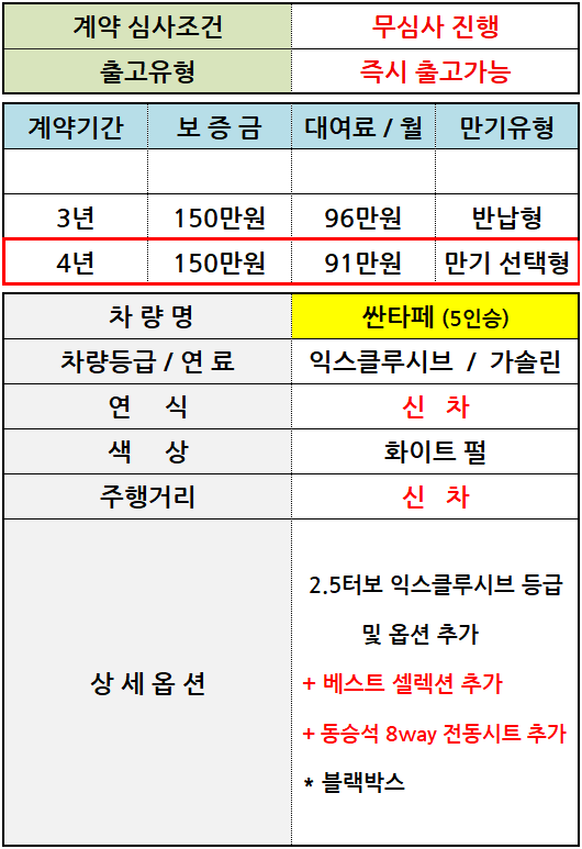 [신차] 싼타페_익스등급_5인승 / 월 91만원
