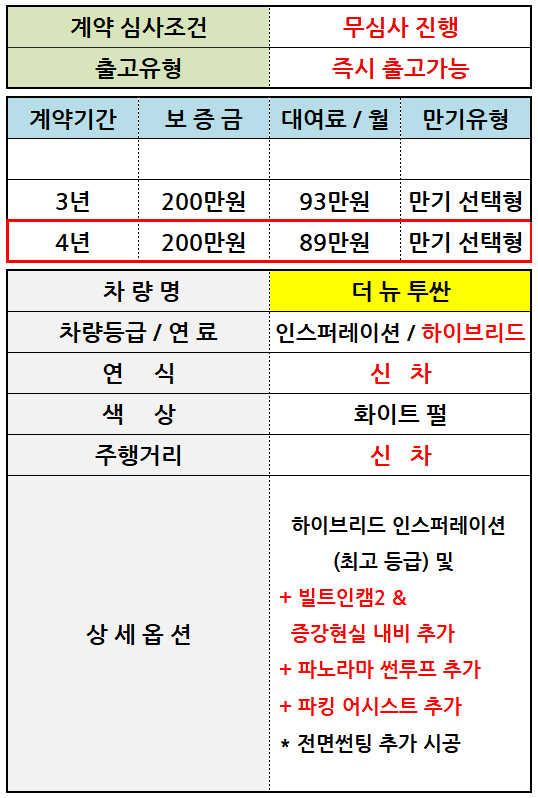 [신차] 투싼_최고등급_하이브리드 / 월 89만원