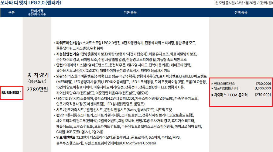 ▶옵션: 렌터카 비지니스1 등급 및 옵션 추가