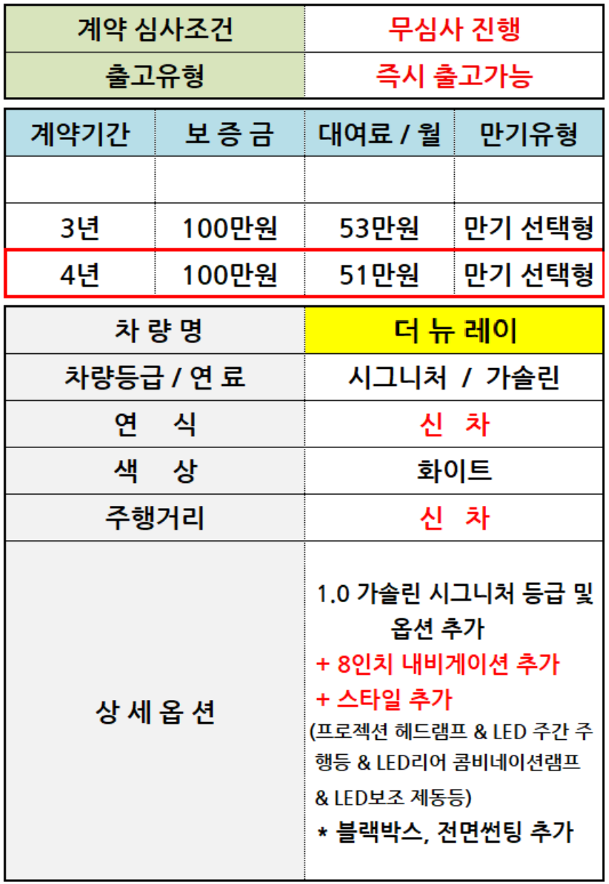 [신차] 더 뉴 레이_시그니처 / 월 51만원